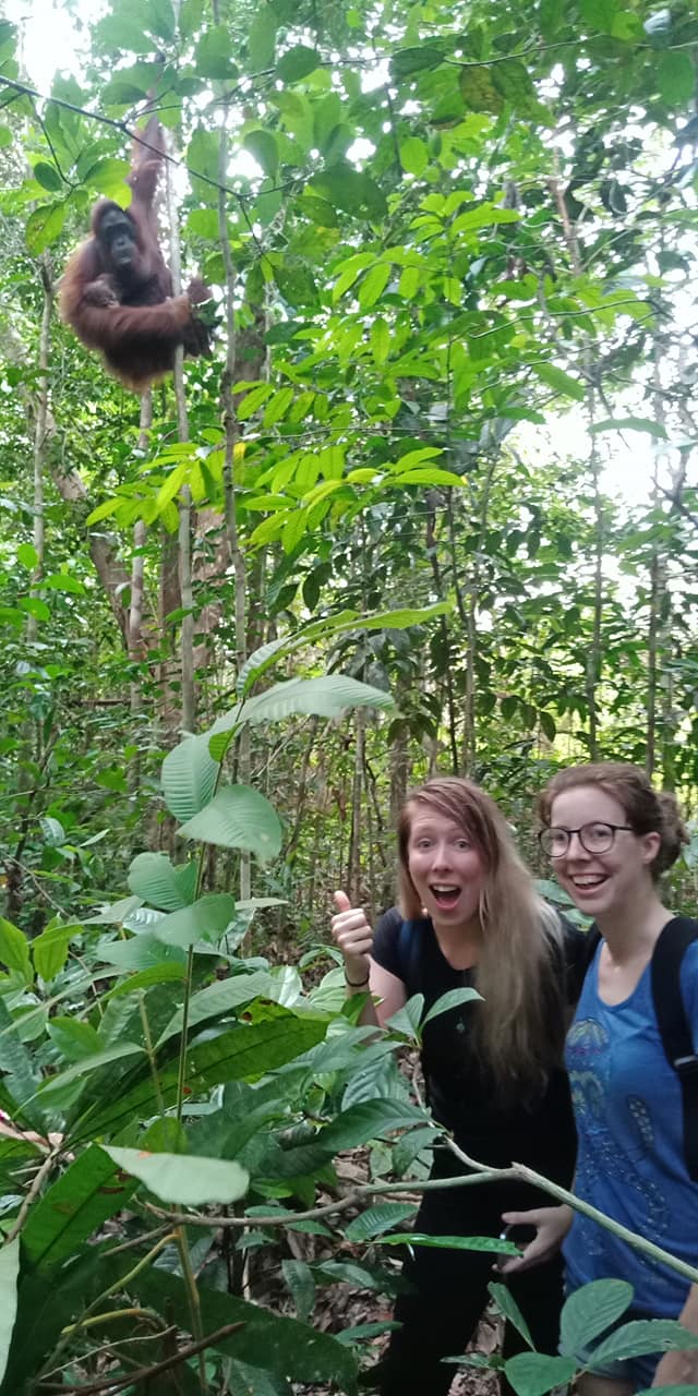 We froze. At maybe two metres above us, they stopped and had a good look. The guide had a mango in his hand that the mother clearly wanted. We stayed still, while the orangutan climbed around us; at one point she broke a branch which almost fell straight on us! When she realised she wasn’t going to get the food (from what I understand, most of the orangutan in this area came from the rehabilitation centre and are confident around people, however the guides are not supposed to give the animals any food), she headed back off up the tree and out of sight.