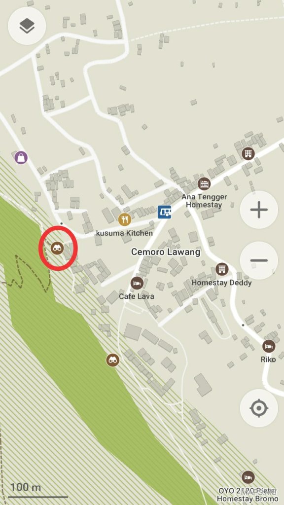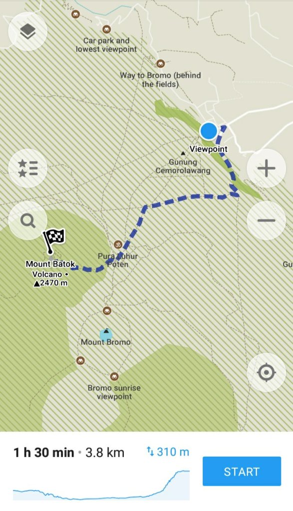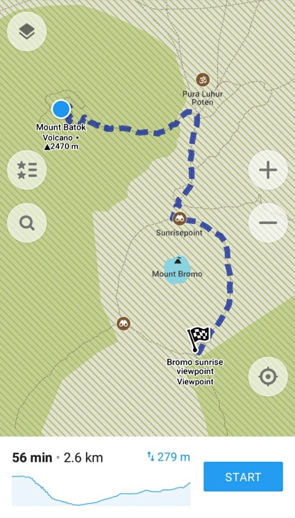 We started at 2am. The road from Cemoro Lawang to the national park is one, long hill, straight up. We used Maps.me to plan our route (image included below). You keep walking until there is a fork in the road and you take the route to the left. It looks like less of a road and you end up at a dead end- but don’t panic! This is where a little dusty footpath appears alongside a house right at the dead end. Follow this! It is dusty as hell and a little steep in places, but it takes you right down onto the sea of sand, right in the Bromo complex!