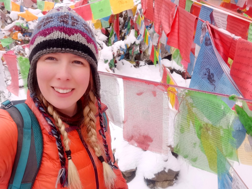 Again, personally I felt the hike was not too difficult. This route is definitely shorter and less steep than the previous day. The weather closed in and it ended up very snowy again, however this led to some beautiful contrast up in the snow line with all the prayer flags!
